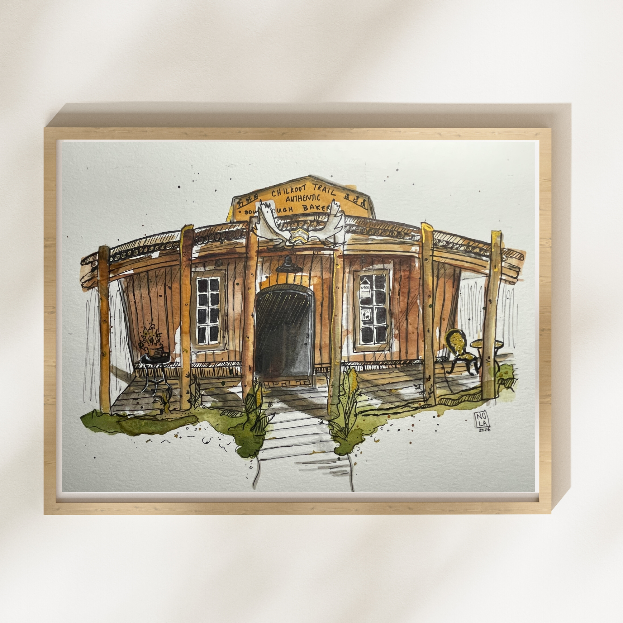 Bring home a slice of small‑town charm with this print of an original ink‑and‑watercolor urban sketch inspired by the Chilkoot Trail Sourdough Bakery tucked into the northern landscapes of Carcross, Yukon.